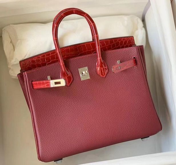Birkin Togo & skinnende krokodille Bordeaux rød & lyse rødt Splint Hardware 25cm Fuld Håndlavet