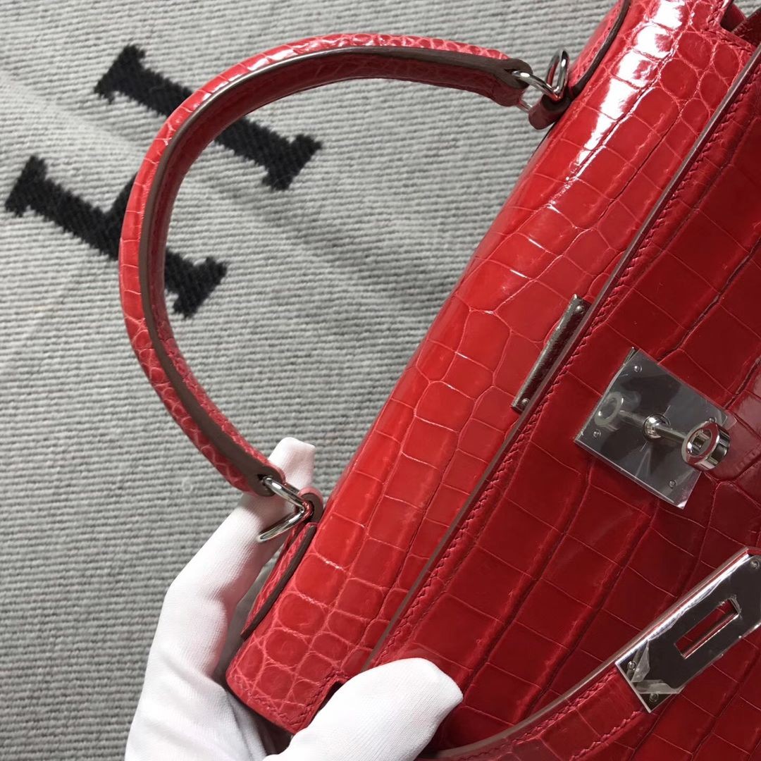 Kelly Alligator Skinnende Watermelon red Silver Hardware 28cm Fuld Håndlavet