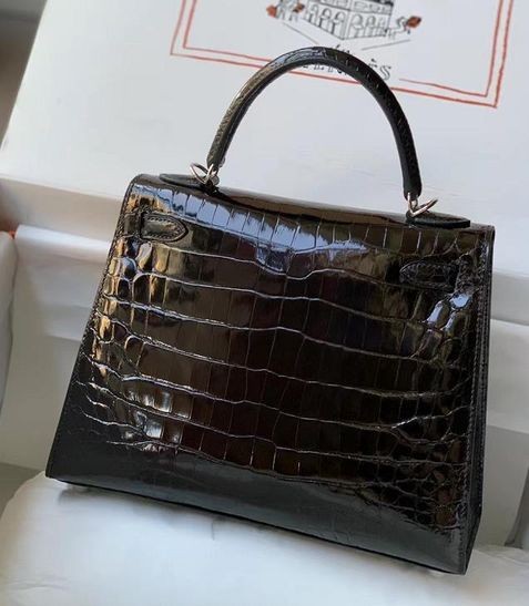Kelly Alligator Shiny Black Silver Hardware 25cm Full Handmade