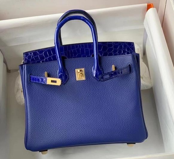 Birkin Érintse meg Togo & fényes krokodil Kék Arany Hardver-25cm, Teljes Kézzel készített