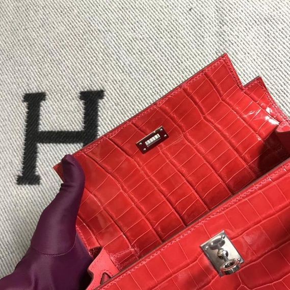 Kelly Alligator Lesklé Ferrari red Strieborná Hardvéru 25 cm Full Ručné